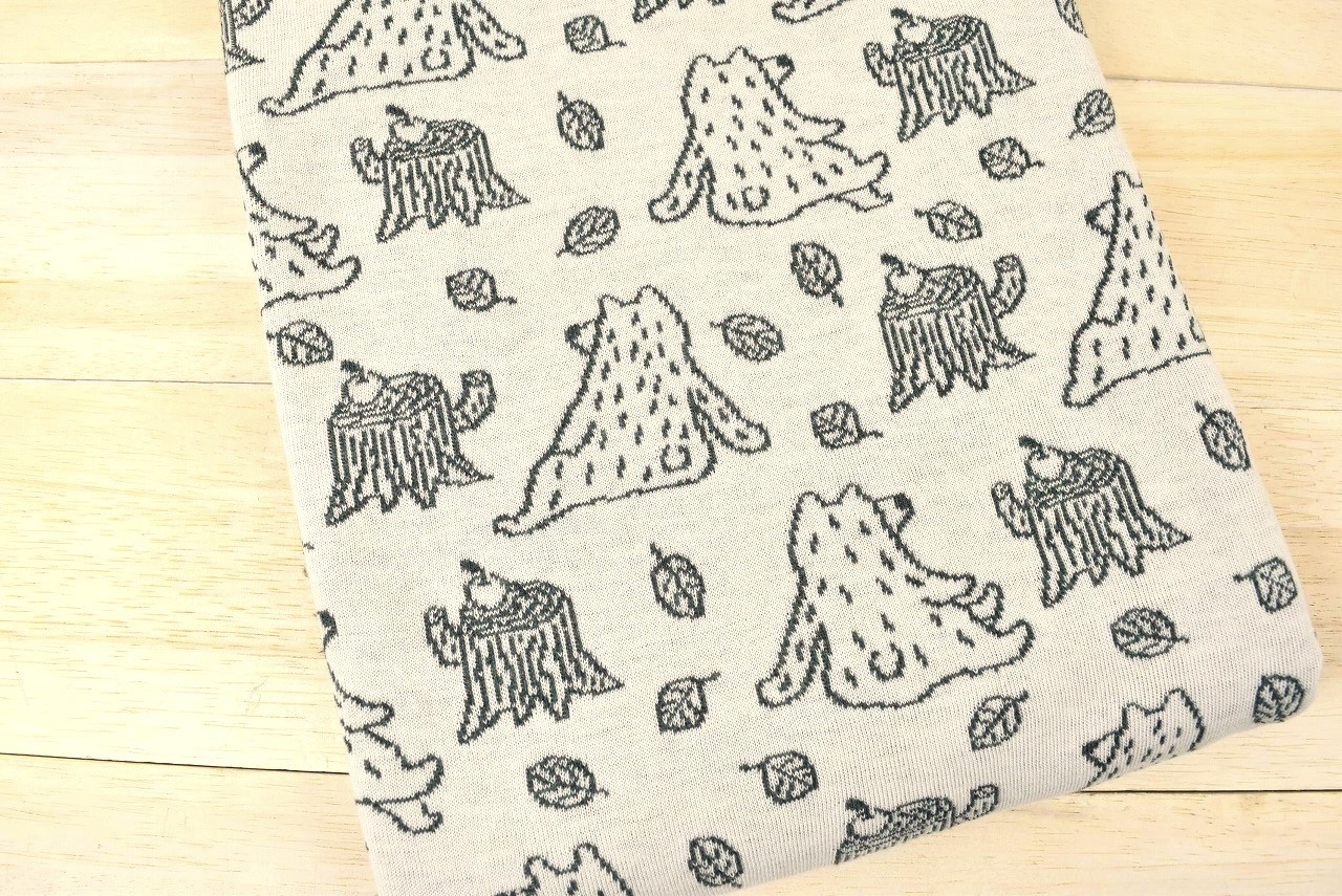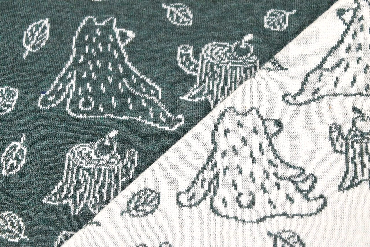リバーシブルジャガードニット生地 森のくまさん柄                    色:杢グリーン/アイボリー