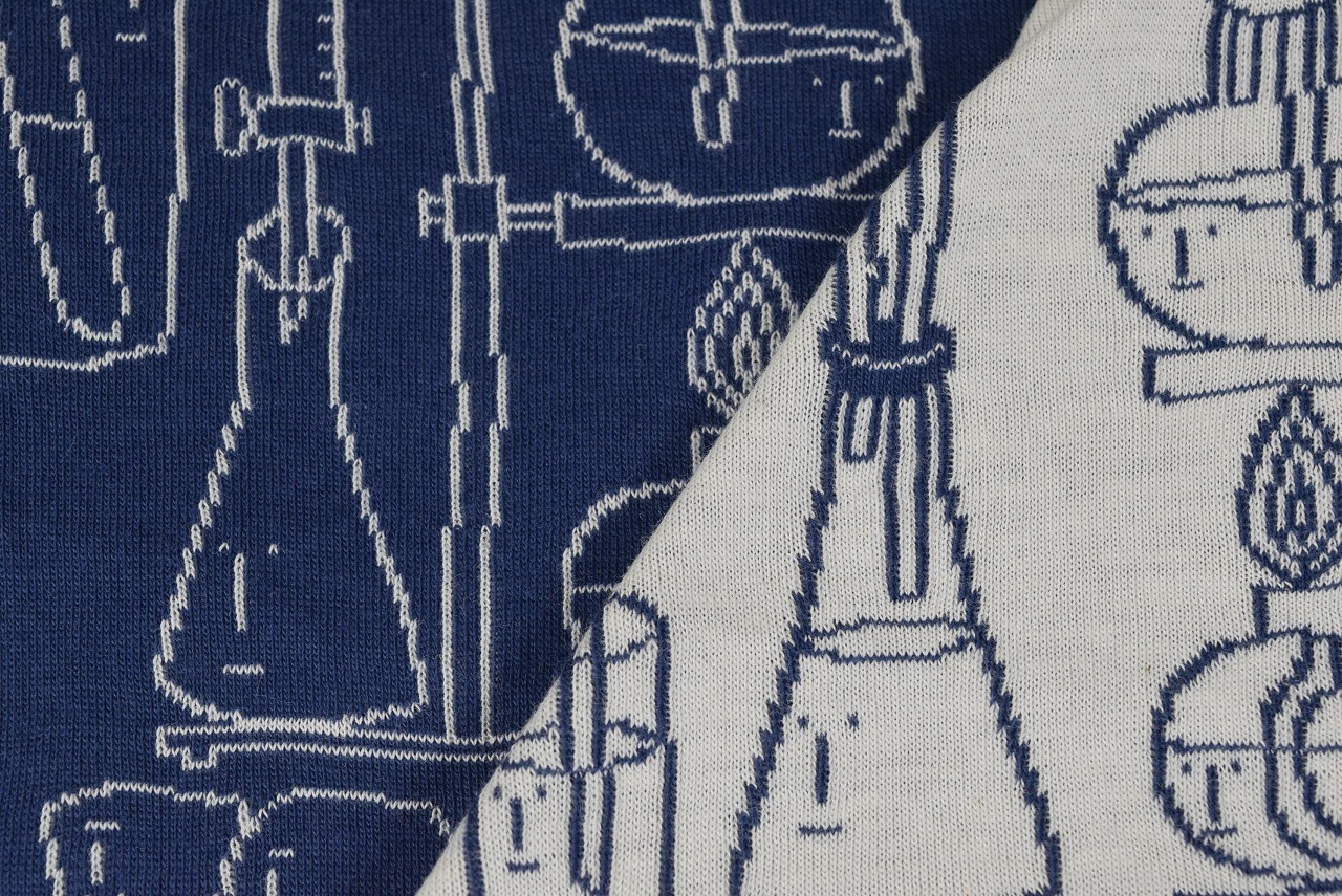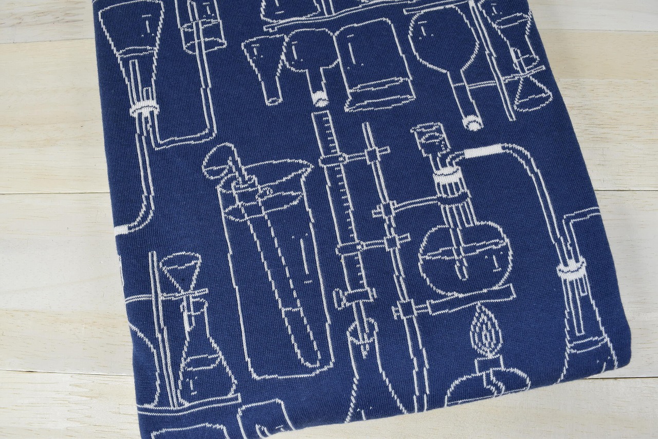 リバーシブルジャガードニット生地 実験道具くんたち柄            色:ダルブルー/アイボリー