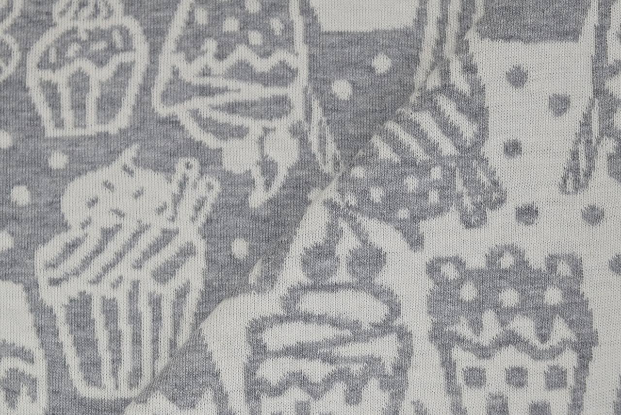 リバーシブルジャガードニット生地 カップケーキ柄           色:杢グレー/アイボリー