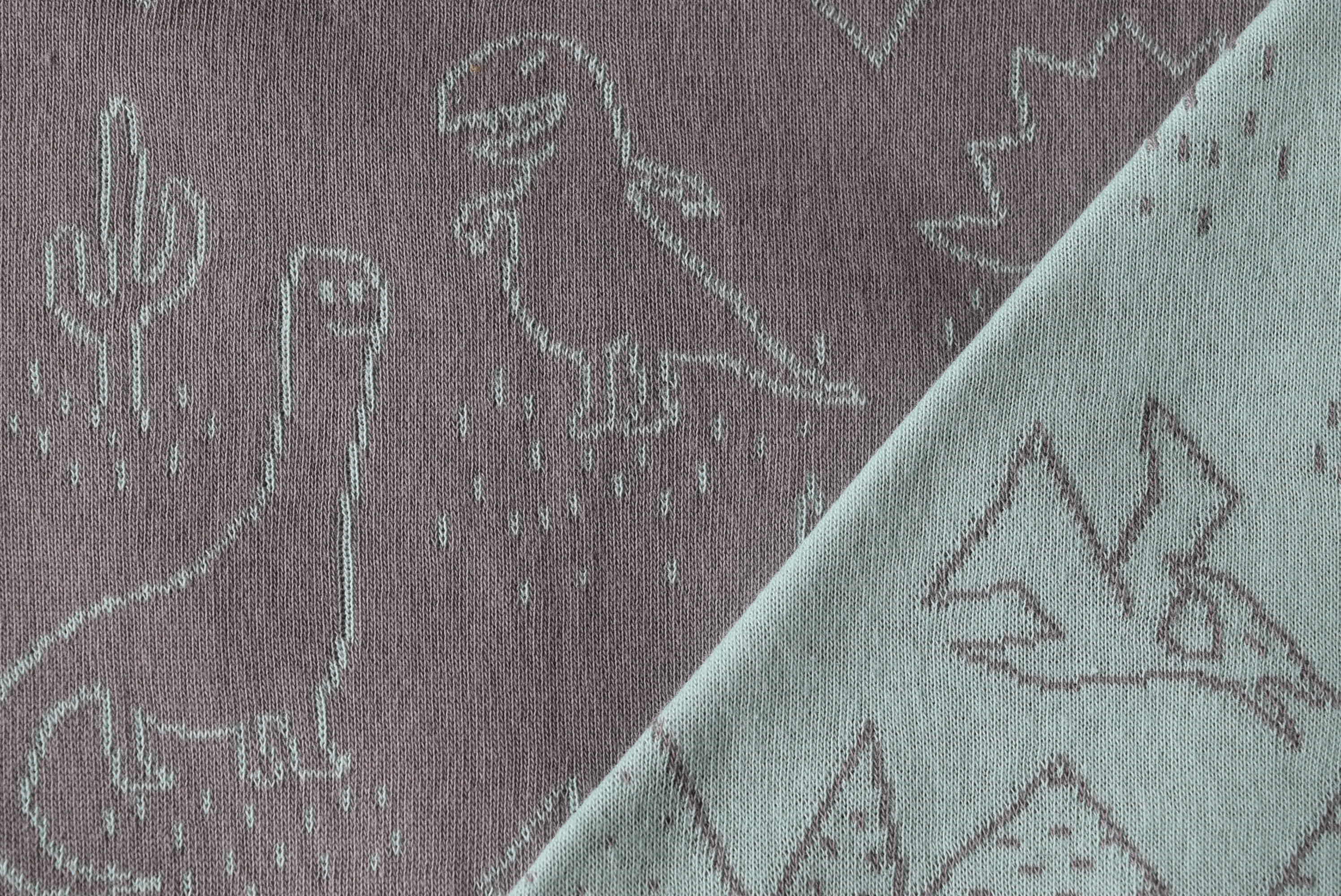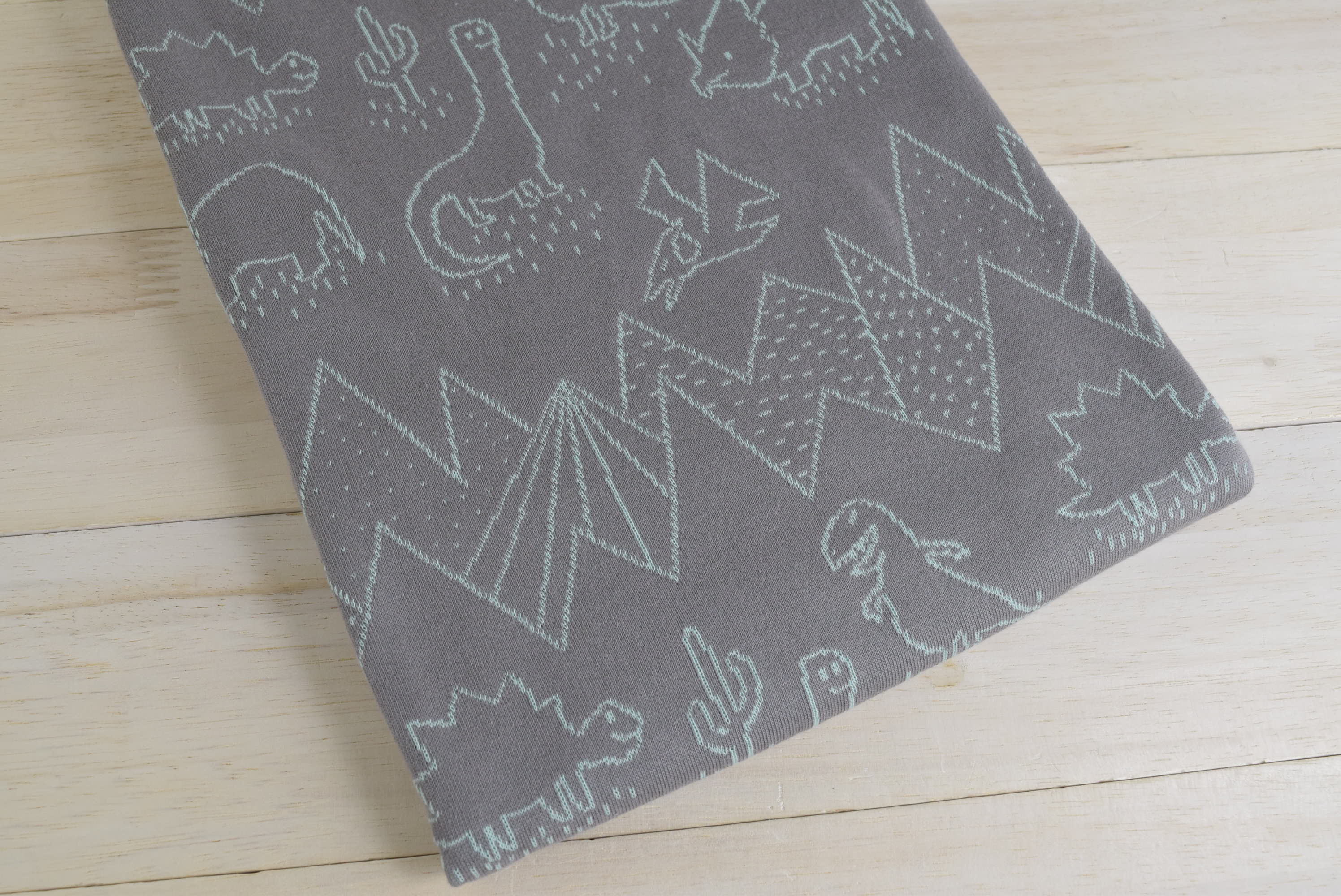 リバーシブルジャガードニット生地 ダイナソー柄         色:ミドルグレー/ミント