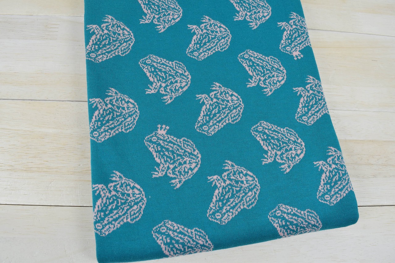 リバーシブルジャガードニット生地 かえる柄                 色:ピーコック/コーラルピンク
