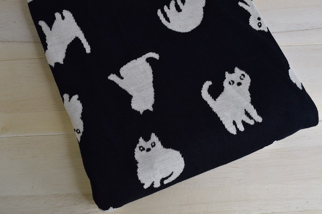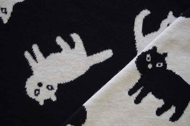 リバーシブルジャガードニット生地 チャビーキャット柄              色:黒/アイボリー