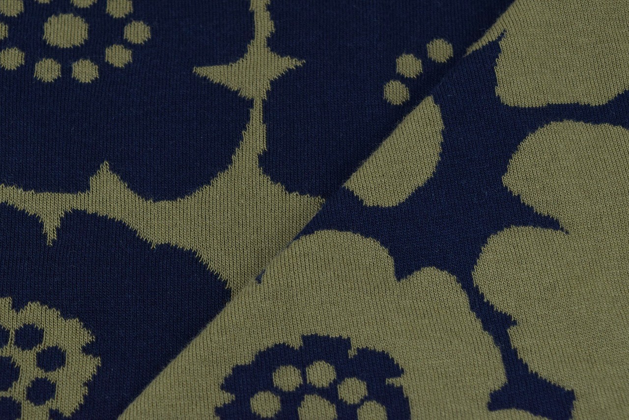 リバーシブルジャガードニット生地 アネモネ柄            色:ネイビー/モスグリーン