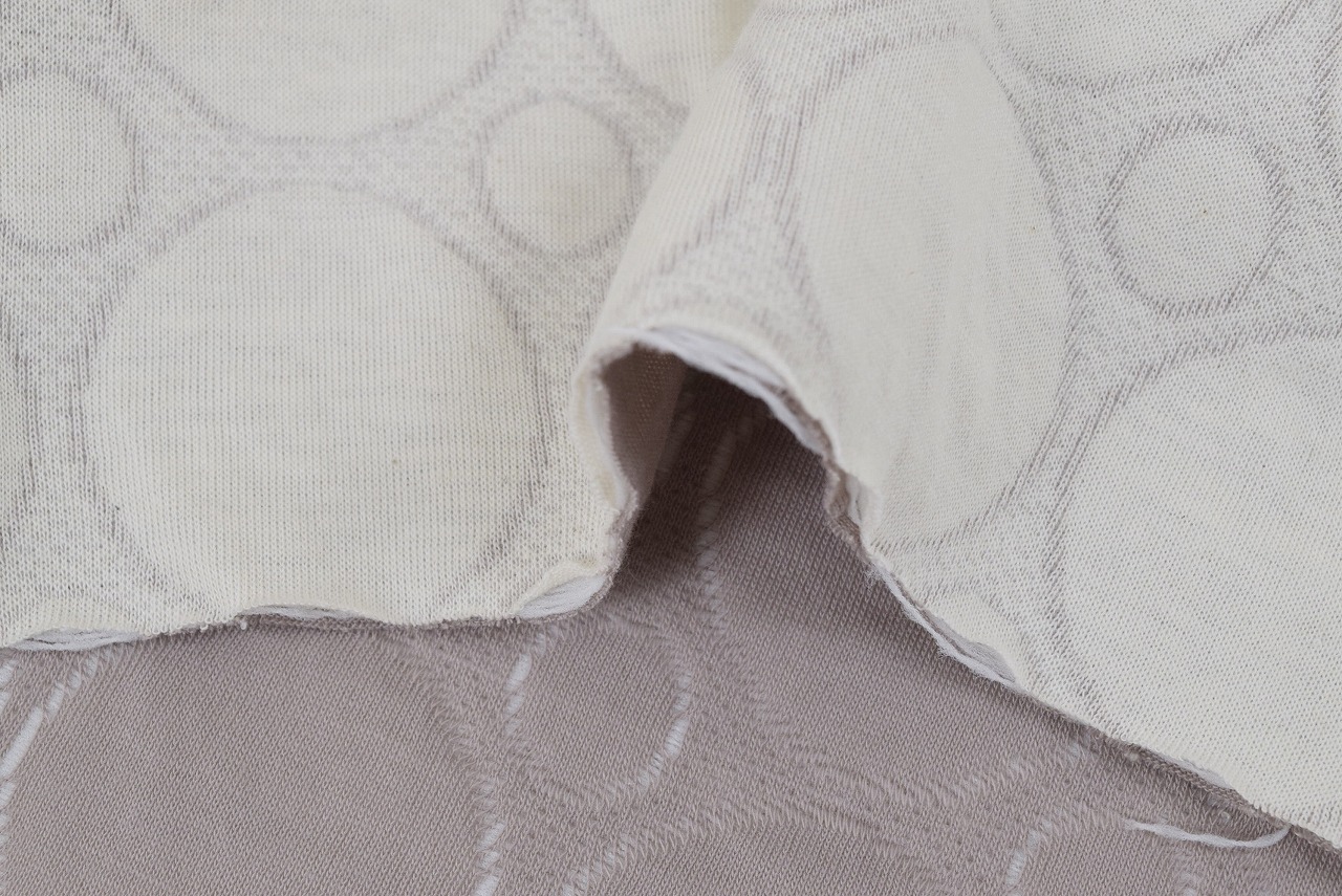 キルトニットの性質上、柄部分より中綿が見える場合がありますが、横方向に引っ張ることにより目立たなくなります。