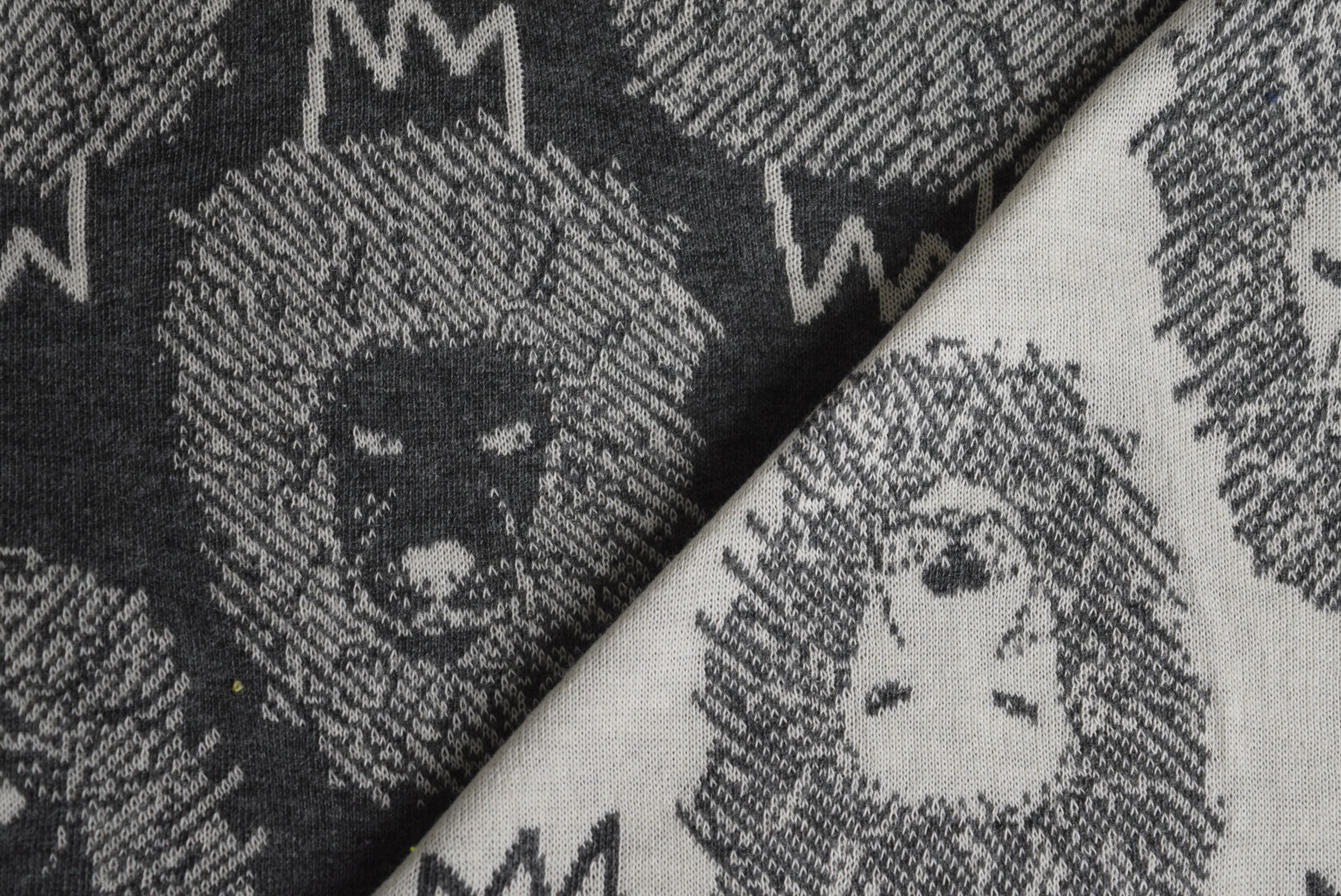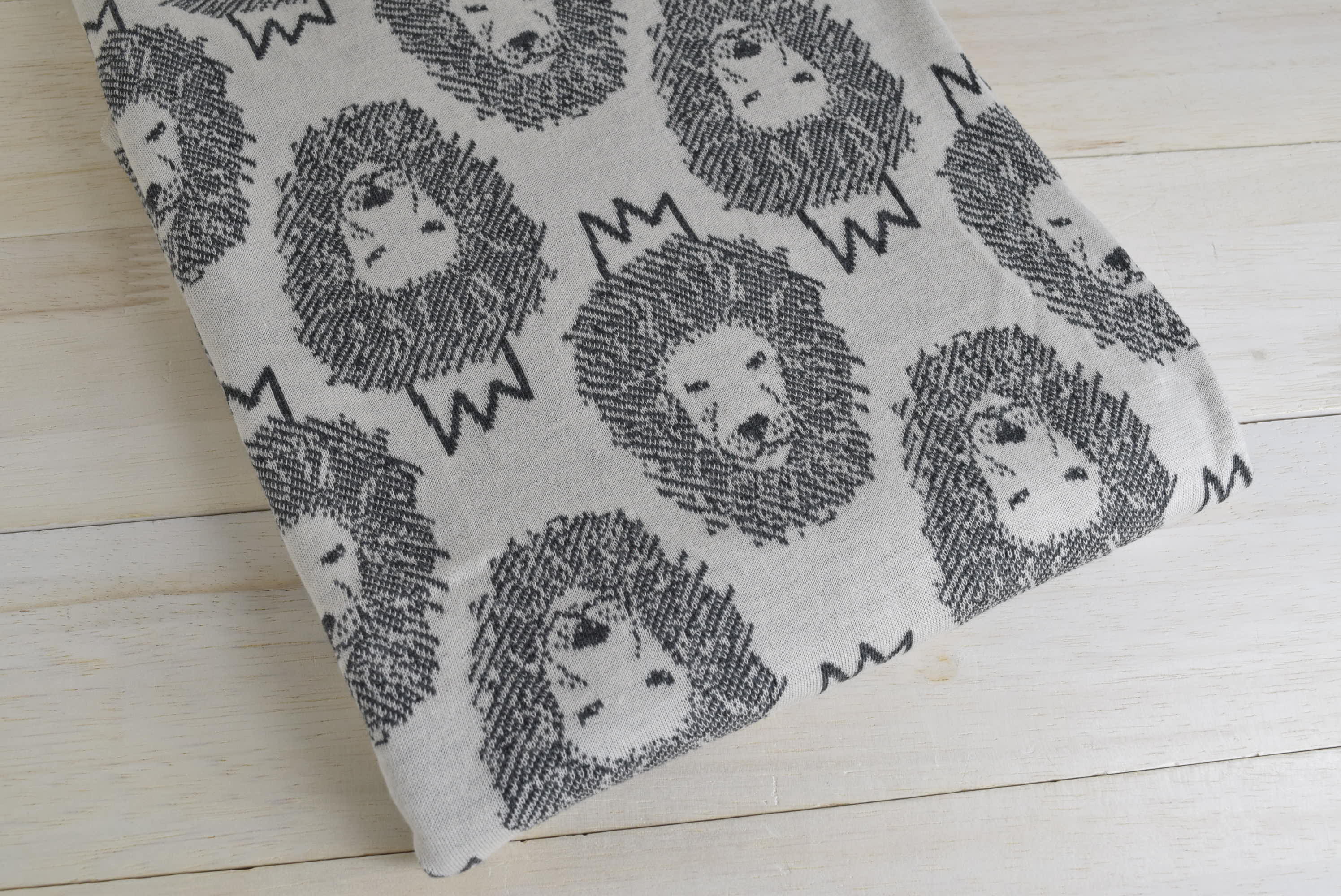 リバーシブルジャガードニット生地 ライオン柄(1.5mカット生地)         色:ダーク杢グレー/バニラ