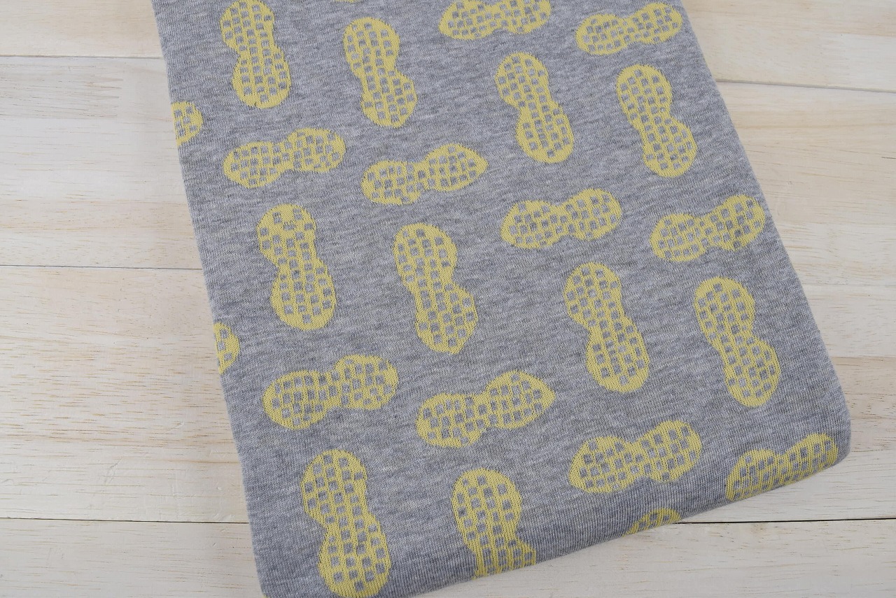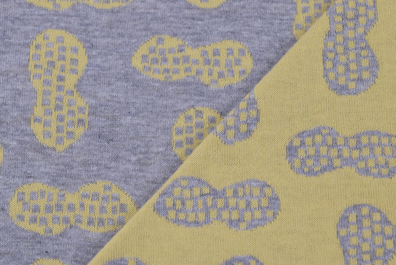 リバーシブルジャガードニット生地 ピーナッツ柄         色:杢グレー/イチョウ
