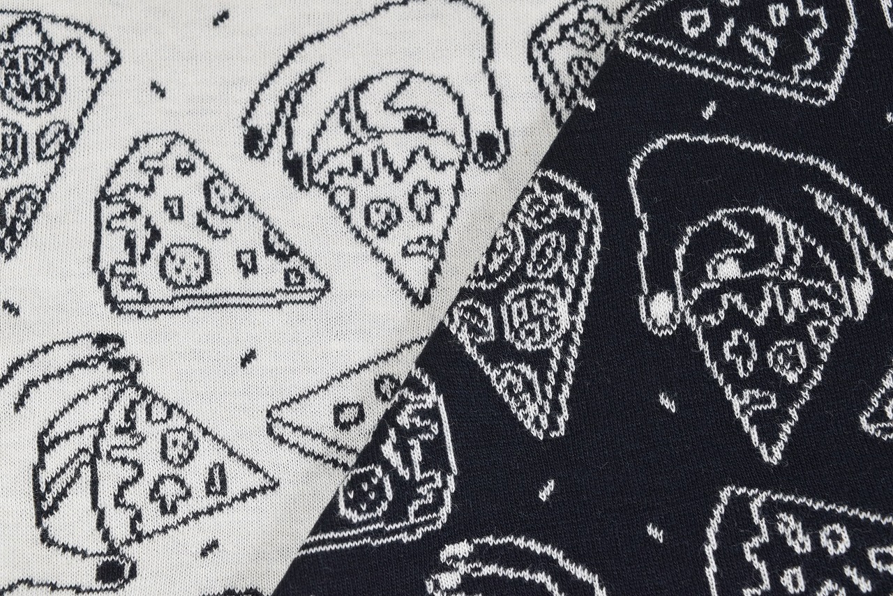 リバーシブルジャガードニット生地 ピザパーティー柄            色:黒/アイボリー