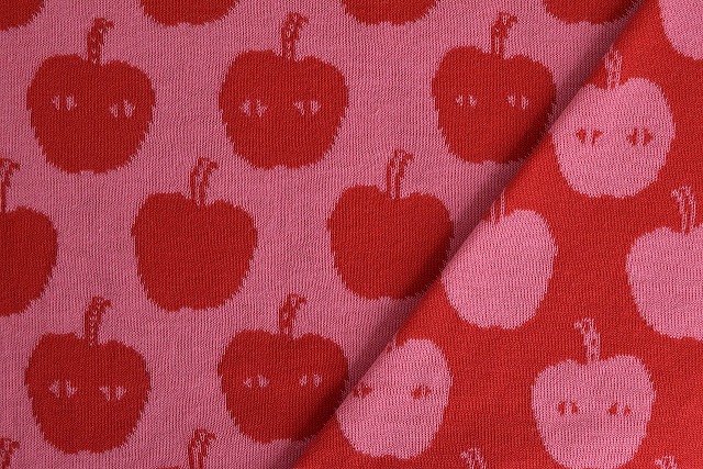 リバーシブルジャガードニット生地 アップルアタック柄            色:レッド/STピンク