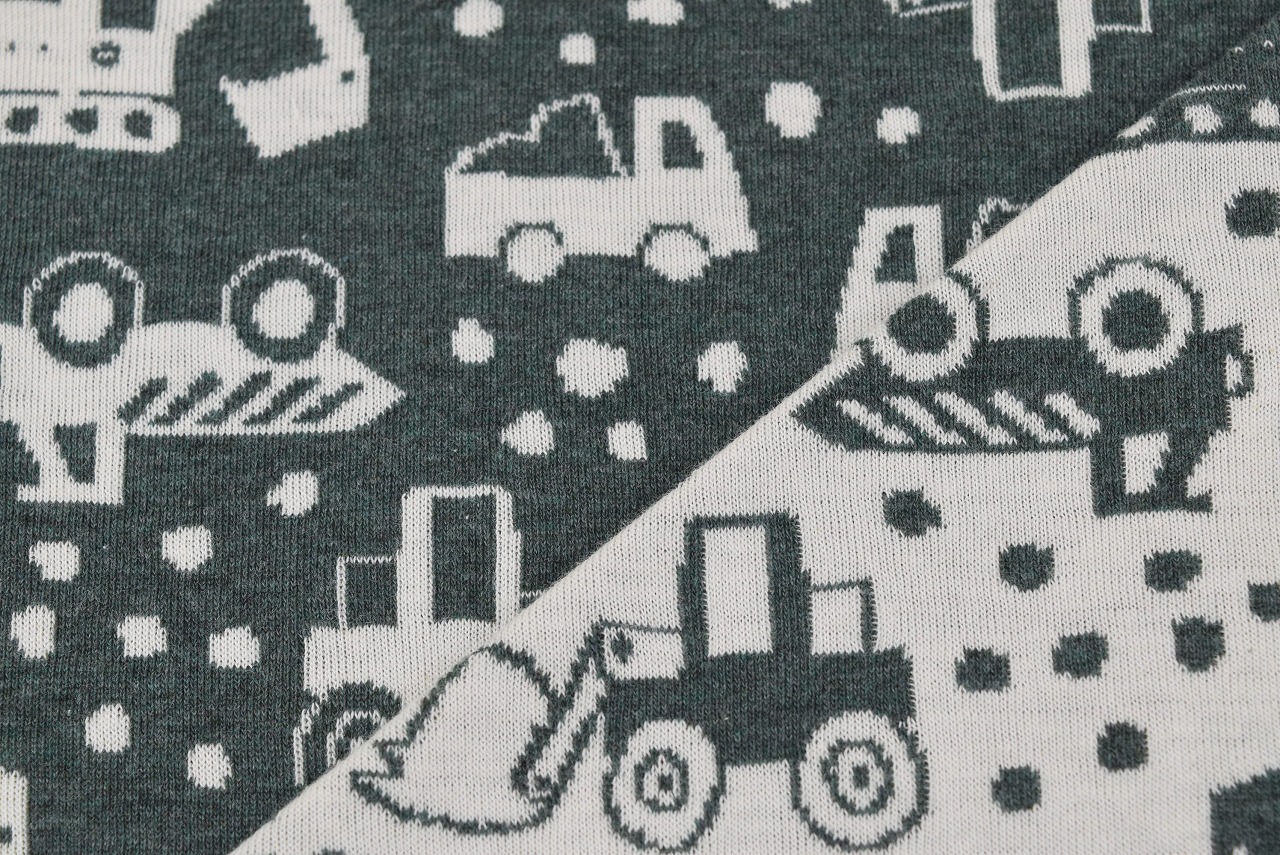リバーシブルジャガードニット生地 ショベルカー柄               色:杢グリーン/アイボリー