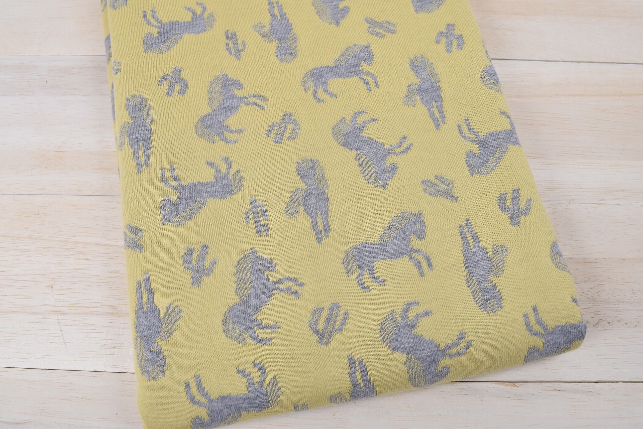リバーシブルジャガードニット生地 ワイルドホース柄         色:杢グレー/イチョウ