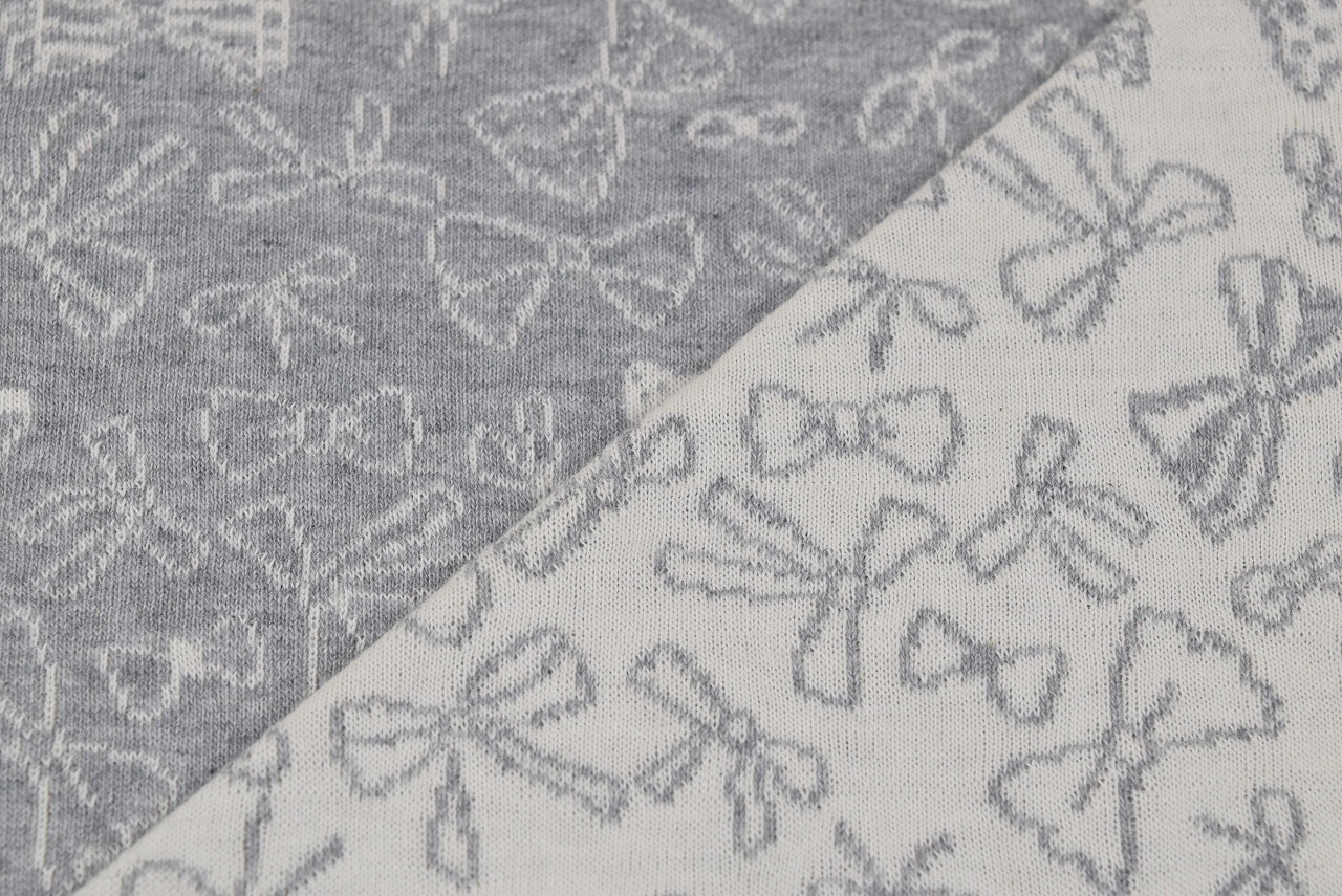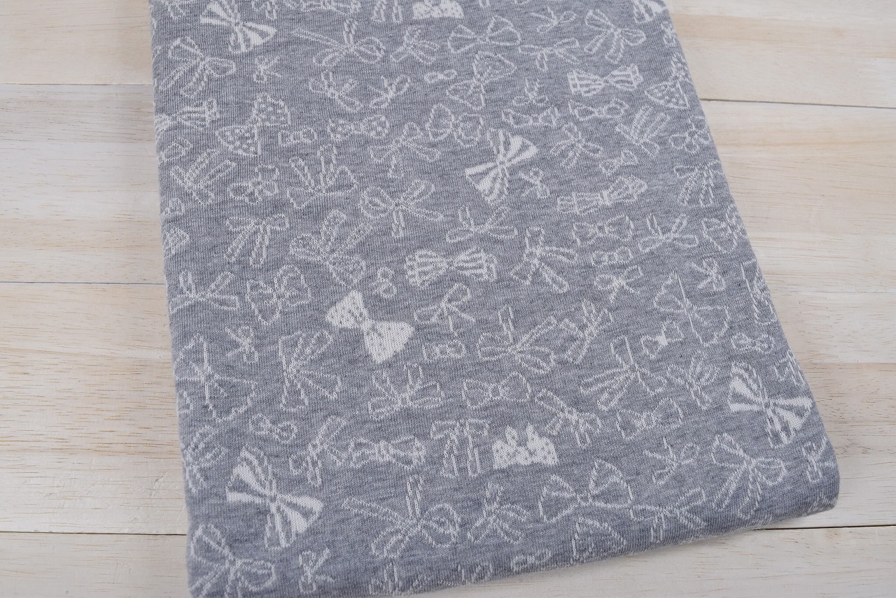 リバーシブルジャガードニット生地 リボンリボン柄         色:杢グレー/アイボリー