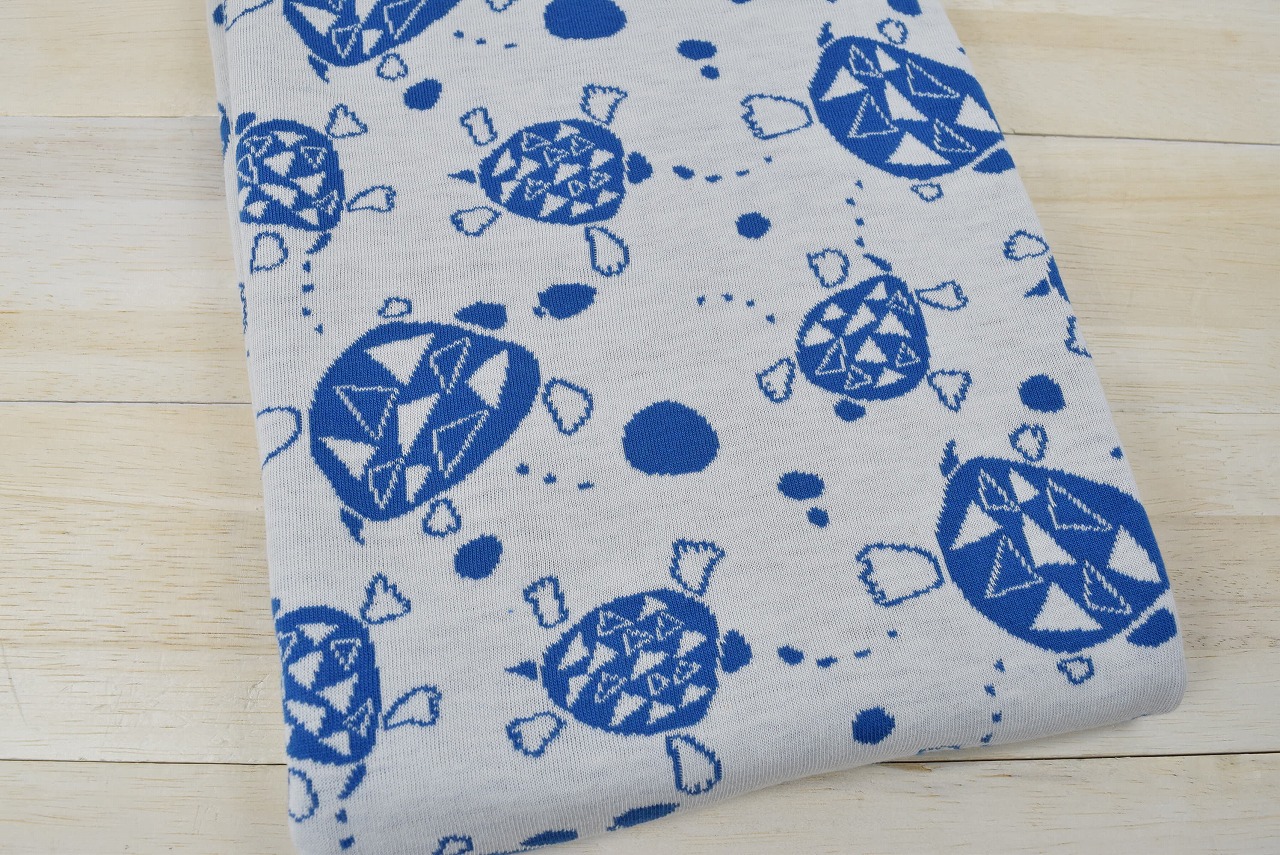 リバーシブルジャガードニット生地 のんびりひと泳ぎ柄           色:ミディアムブルー/アイボリー