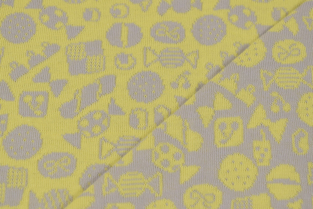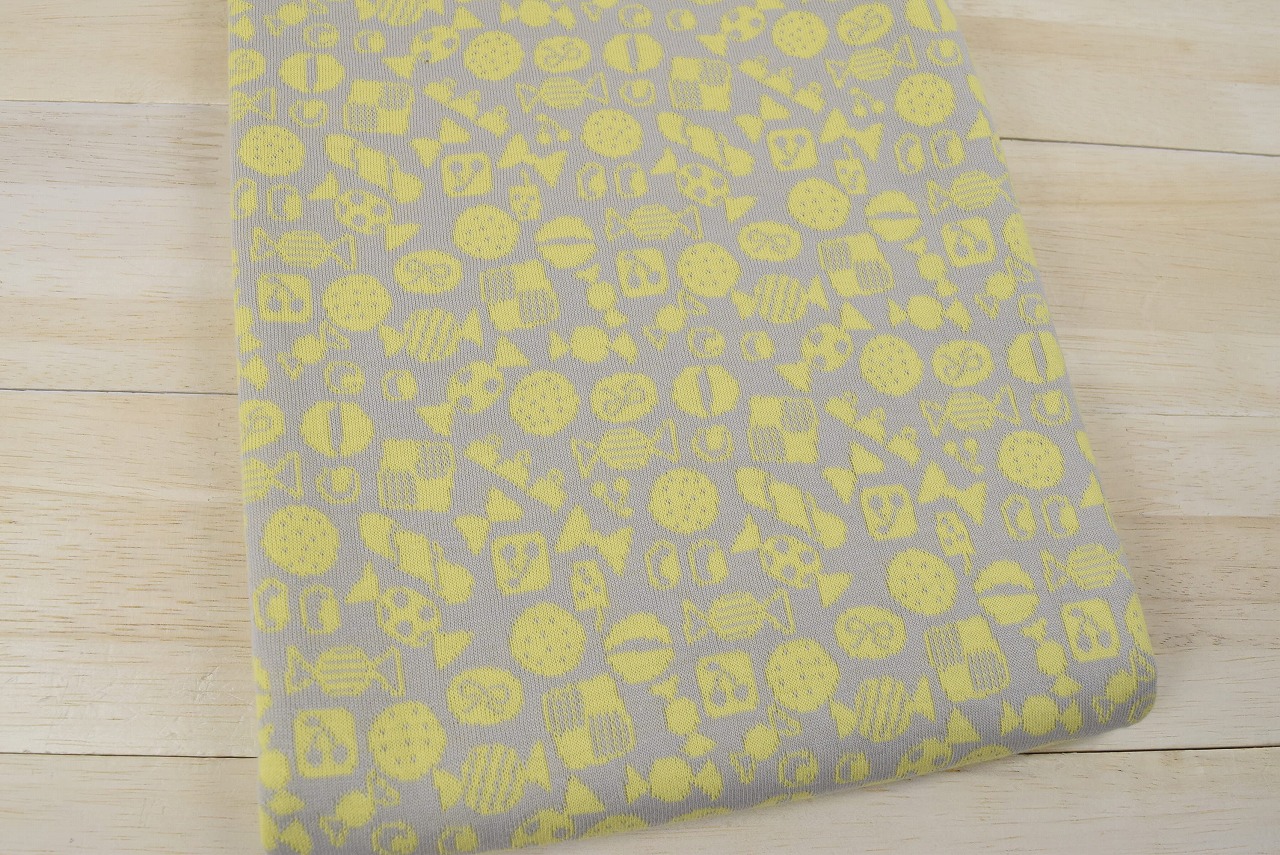 リバーシブルジャガードニット生地 おかし柄           色:ライトグレー/レモン