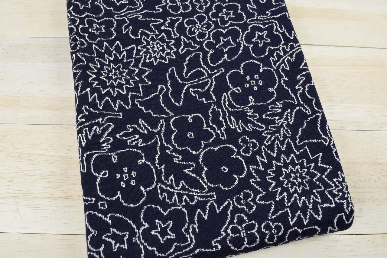 リバーシブルジャガードニット生地 ブルームパレード柄           色:濃紺/アイボリー