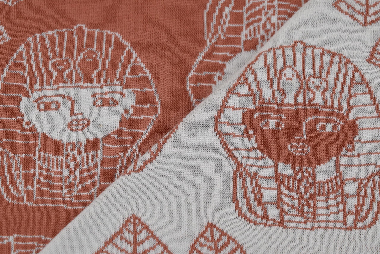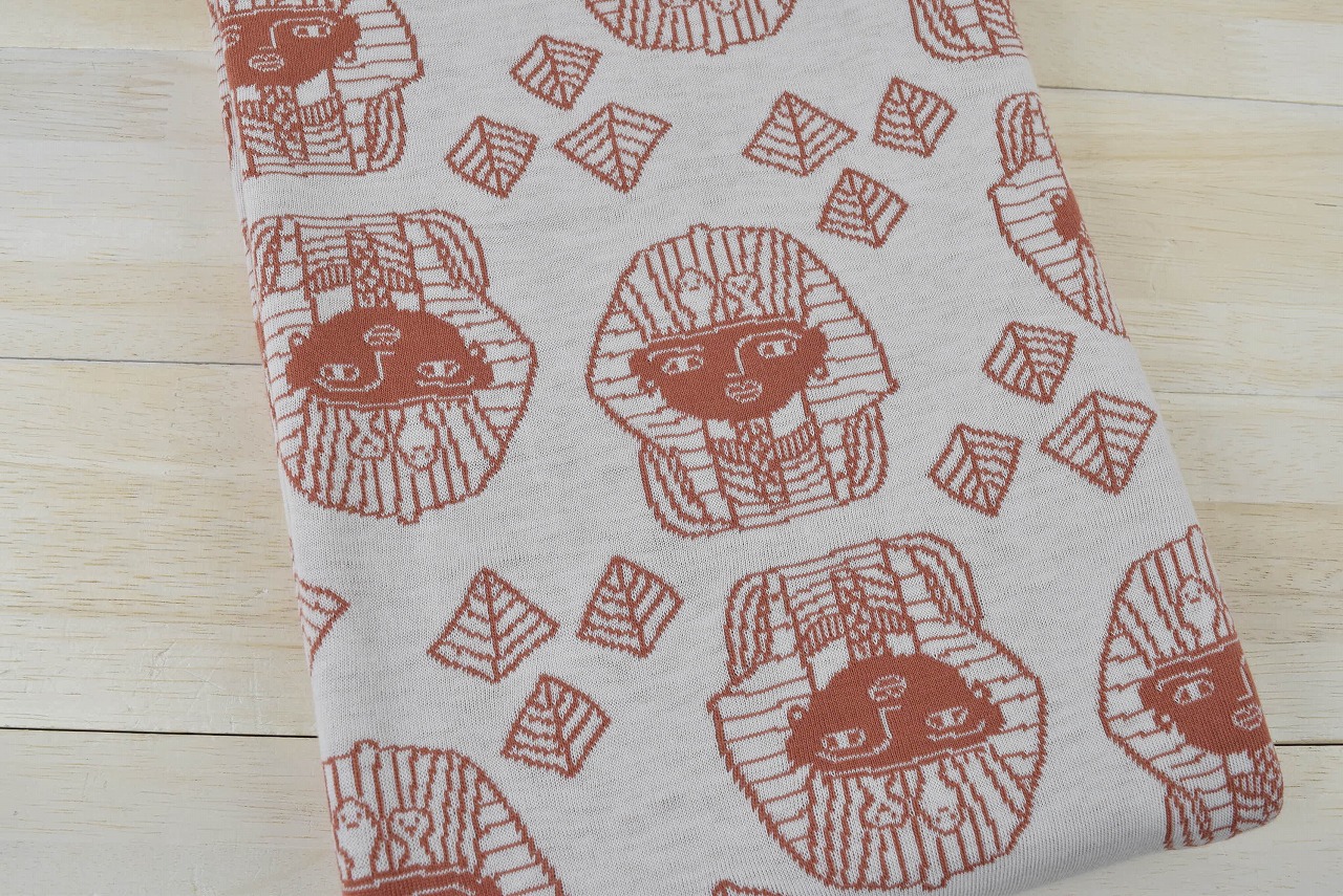 リバーシブルジャガードニット生地 ツタンカーメン柄         色:アーモンド/アイボリー