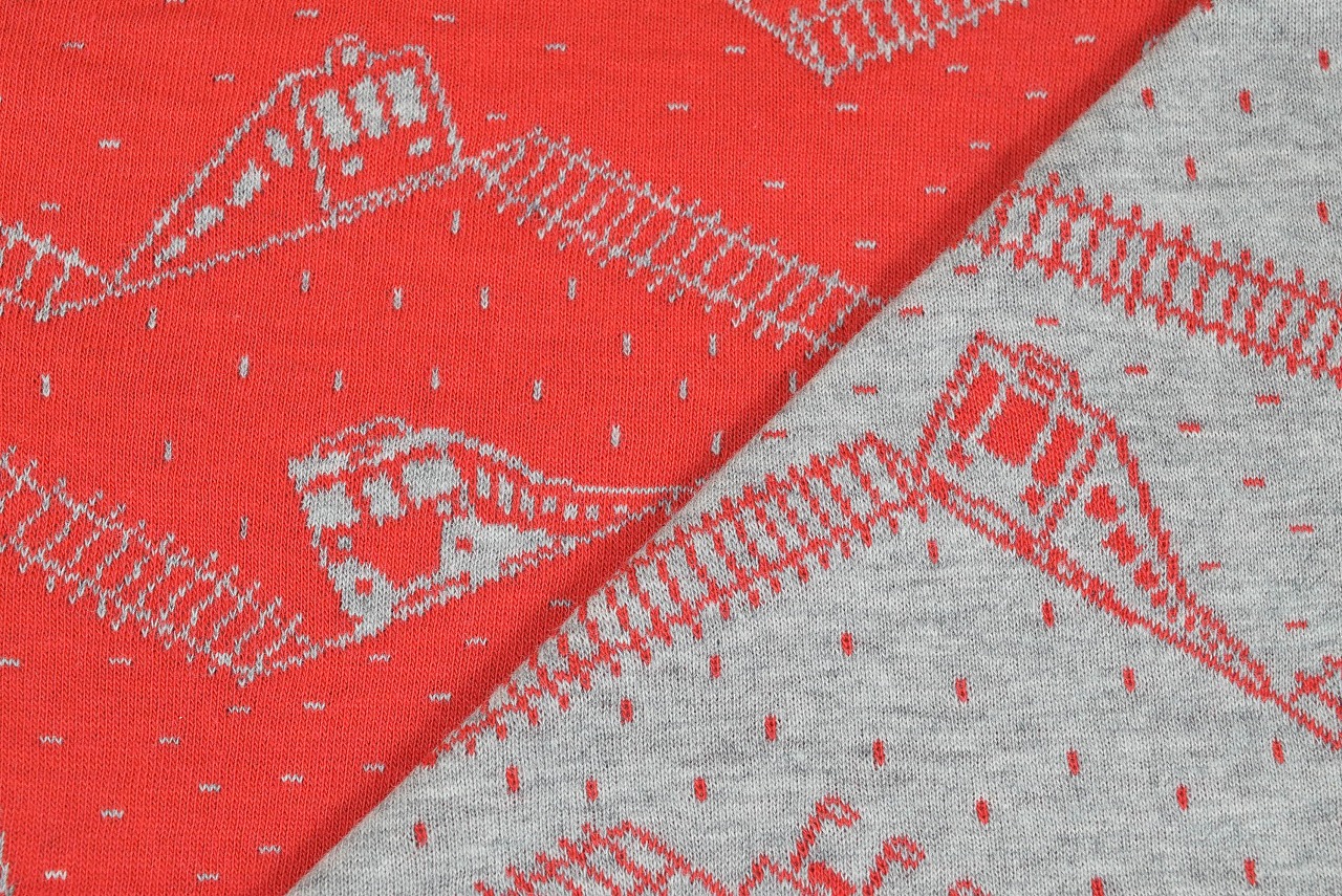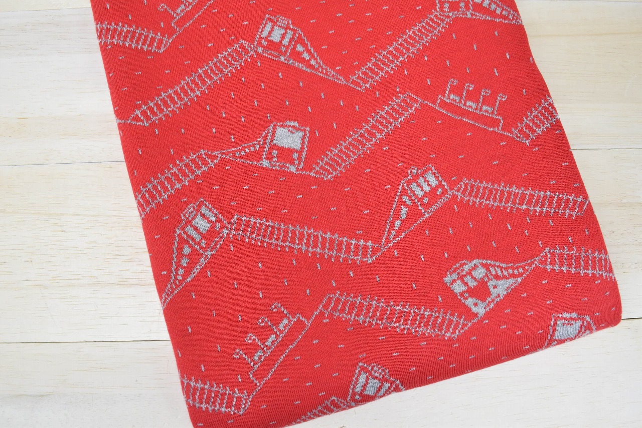リバーシブルジャガードニット生地 トレイン柄(1mカット生地)           色:杢グレー/レッド