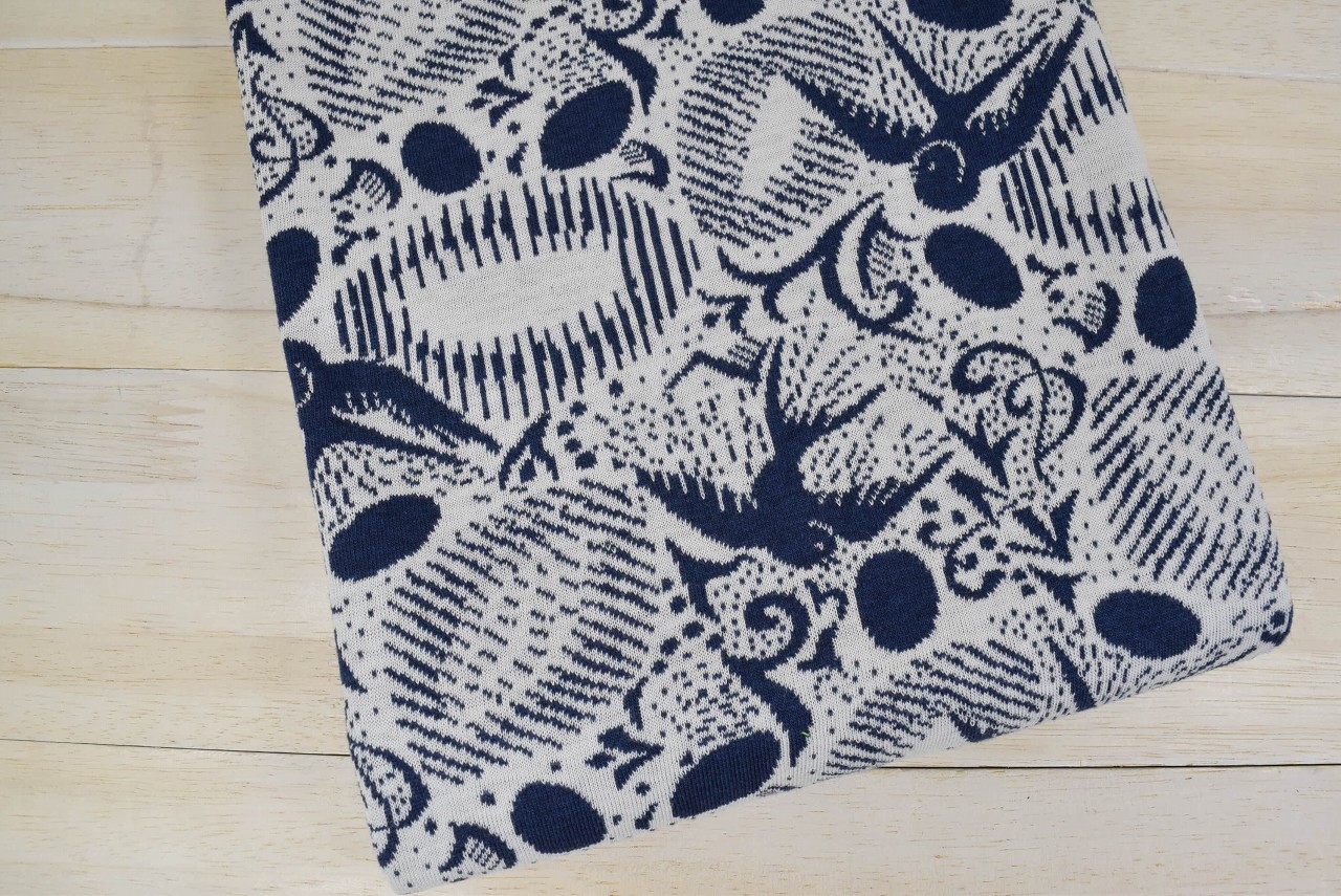 リバーシブルジャガードニット生地 スワロウ柄                色:ダルブルー/アイボリー