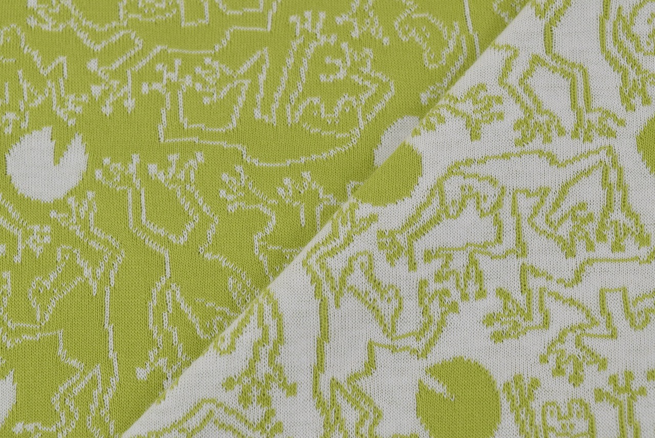 リバーシブルジャガードニット生地 フロッグス柄                  色:青りんご/アイボリー