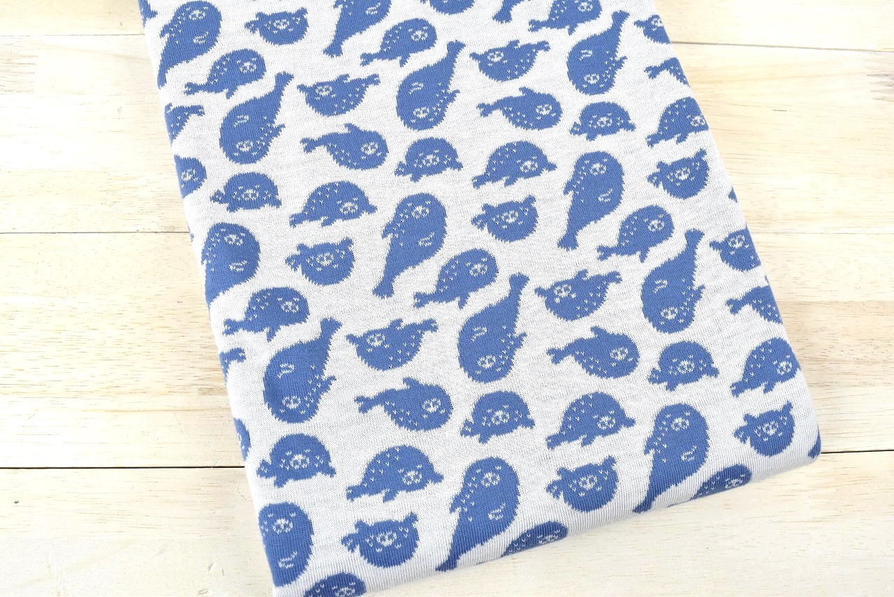 リバーシブルジャガードニット生地 ぷかぷかごまちゃん柄               色:デニム/アイボリー