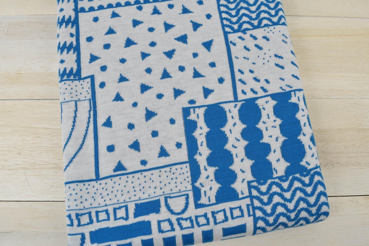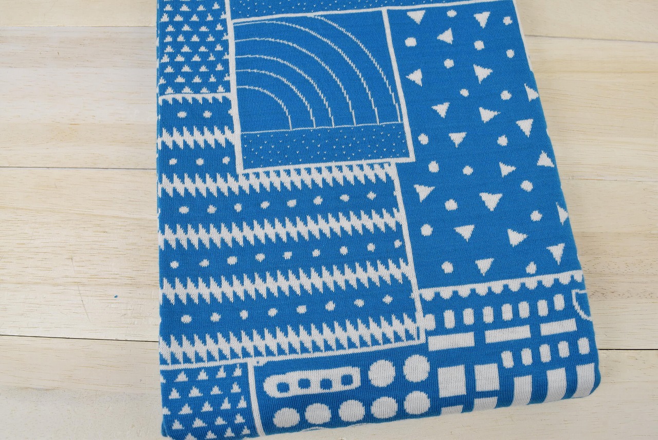 リバーシブルジャガードニット生地 ミニパネル柄            色:ブルーラグーン/アイボリー
