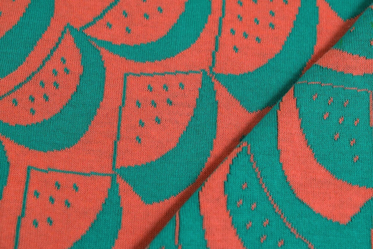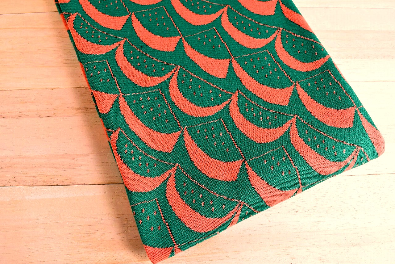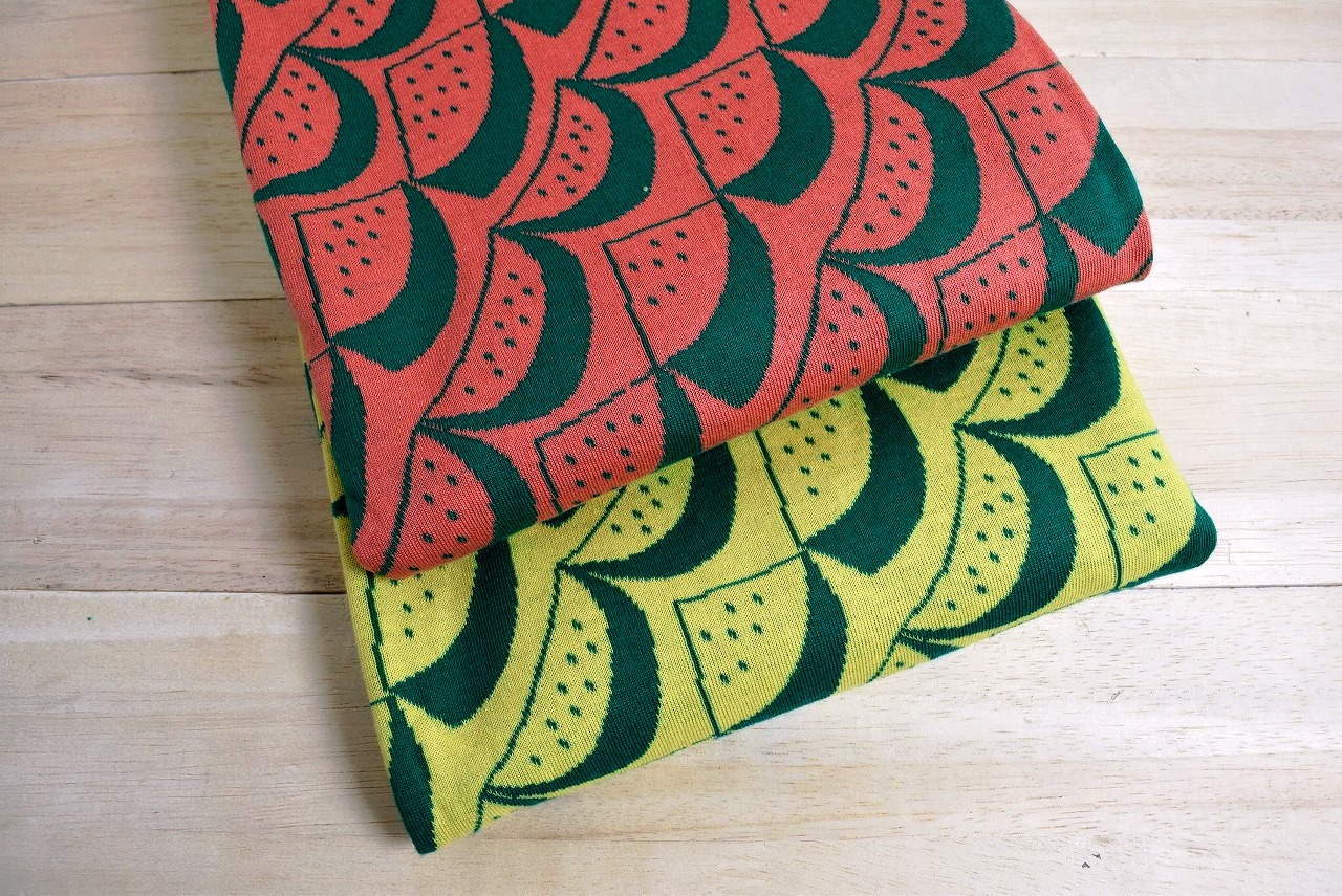 リバーシブルジャガードニット生地 スイカ柄            色:グリーン/フラミンゴ