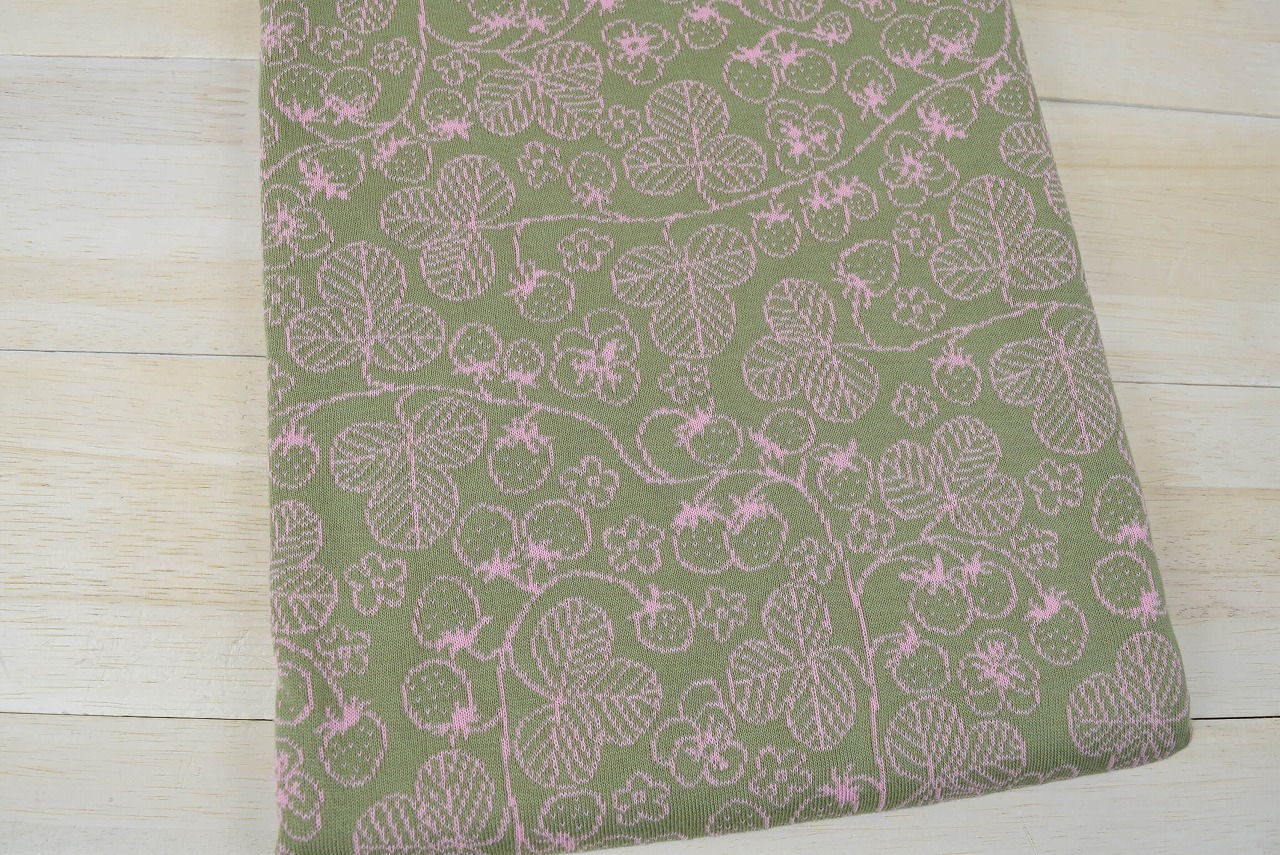 リバーシブルジャガードニット生地 ワイルドストロベリー柄             色:グラスグリーン/フレッシュピンク
