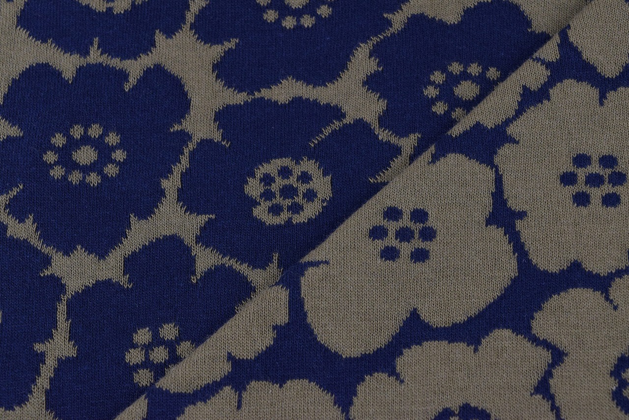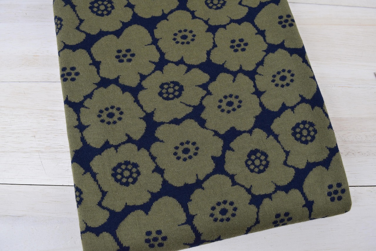リバーシブルジャガードニット生地 ミニアネモネ柄         色:ネイビー/モスグリーン