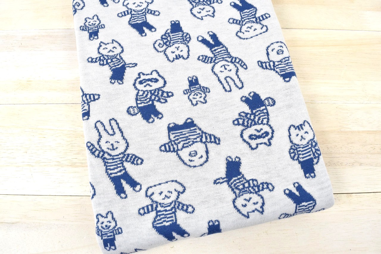 リバーシブルジャガードニット生地 〈くしゃかわ×maffon〉ボーダーびより柄         色:ジェイブルー/アイボリー