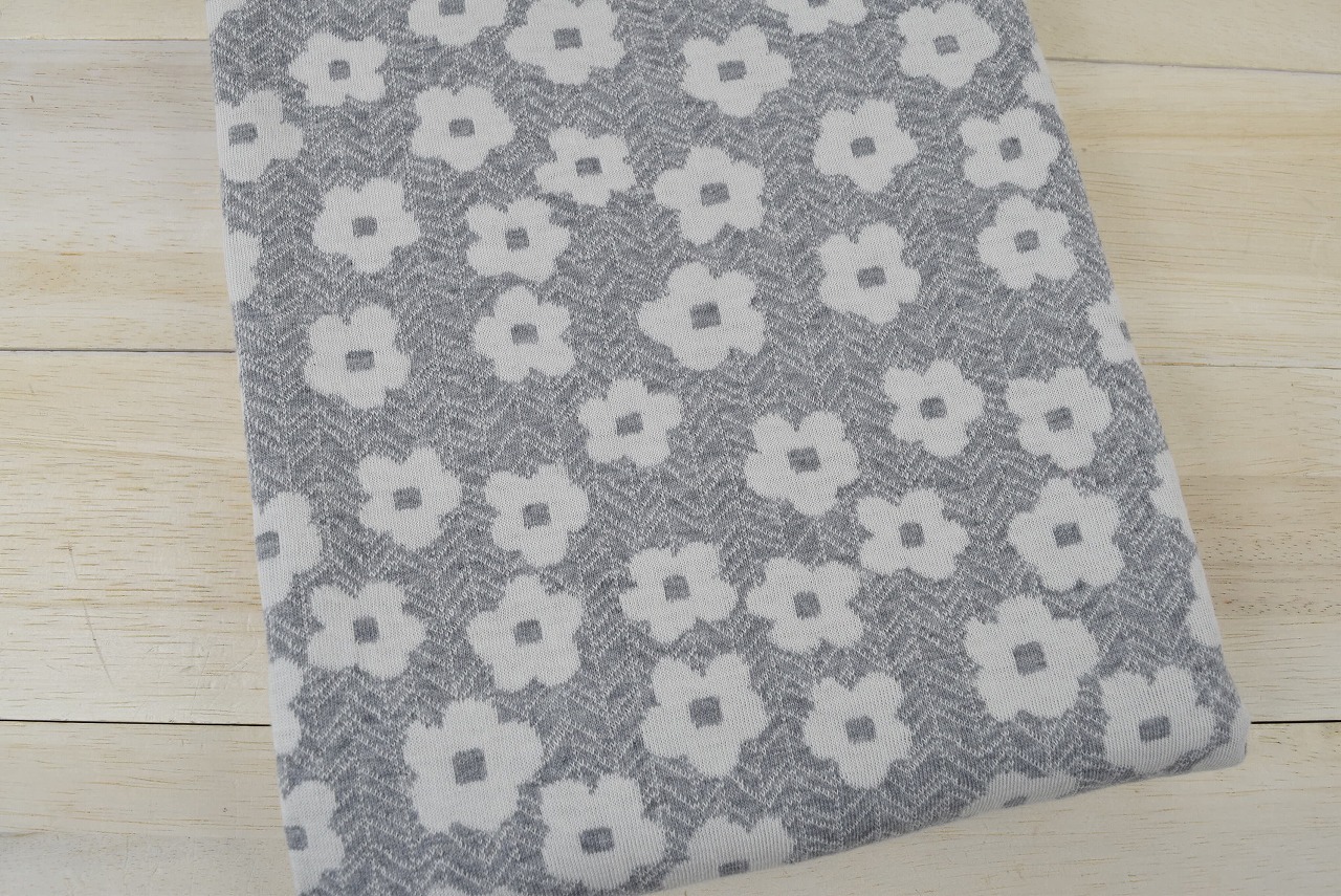 リバーシブルジャガードニット生地 木と花柄 (1m+品番マーク入り) 色:杢グレー/アイボリー