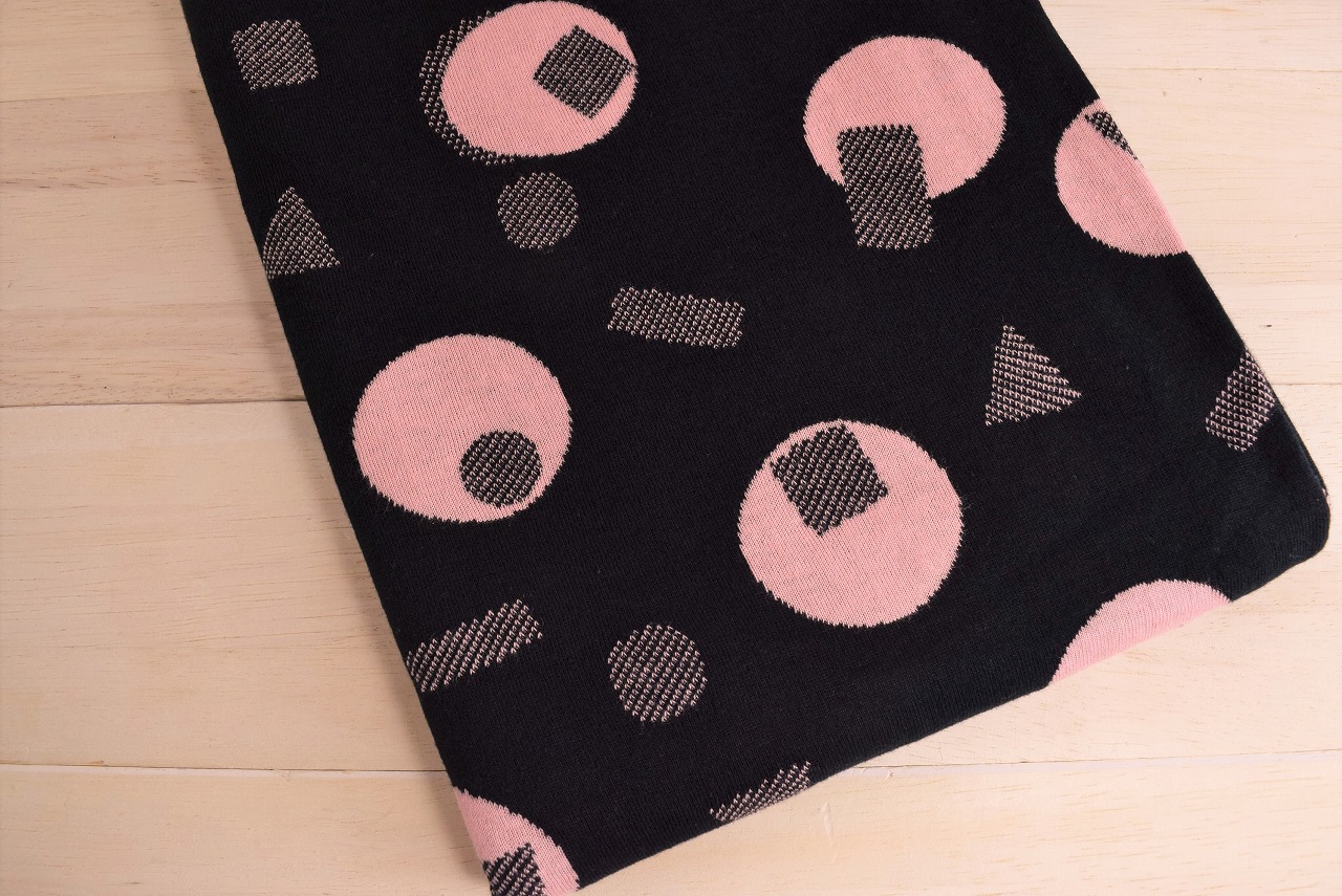 リバーシブルジャガードニット生地 ピチカート柄 色:黒/コーラルピンク