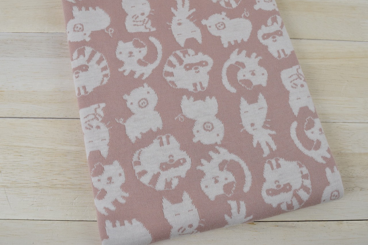 リバーシブルジャガードニット生地 こぶたぬきつねこ柄 色:ピンクベージュ/アイボリー