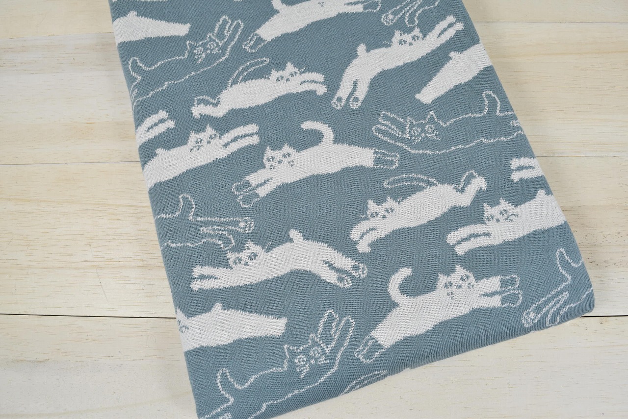 リバーシブルジャガードニット生地 ねこのぼり柄 色:アロエ/アイボリー