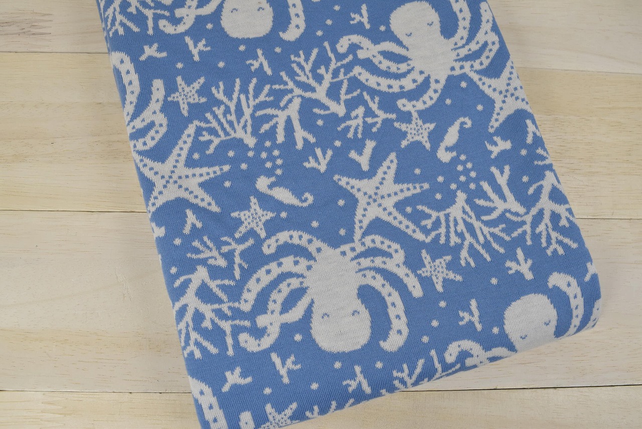 リバーシブルジャガードニット生地 オクトパス柄 色:ブルー/アイボリー