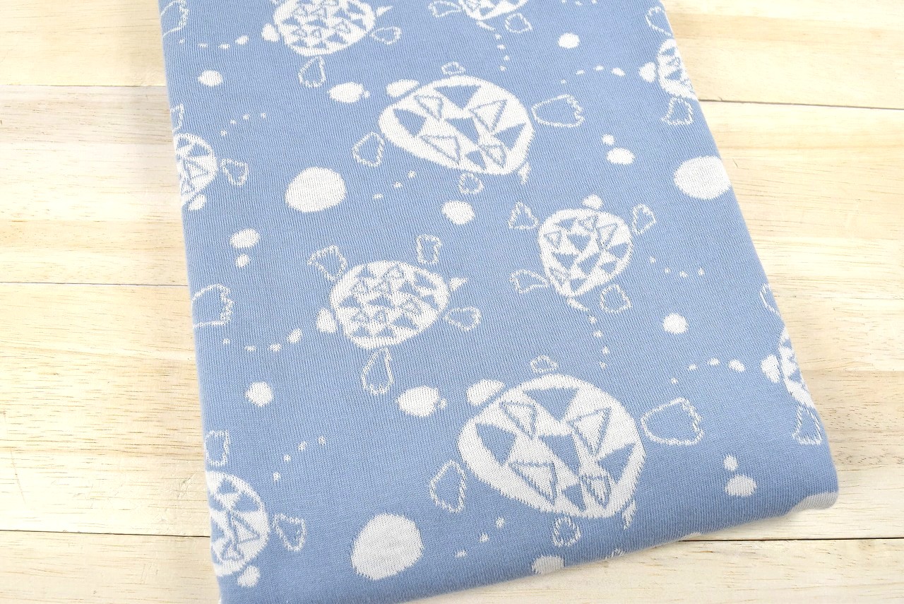 リバーシブルジャガードニット生地 のんびりひと泳ぎ柄 色:ミディアムブルー/アイボリー