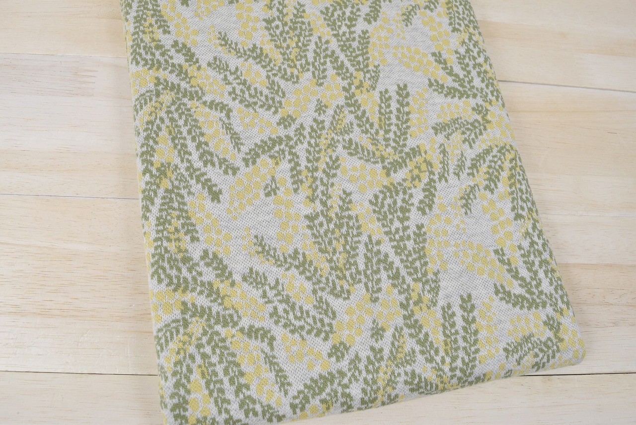 3色ジャガードニット生地 ミモザ柄 色:アッシュ杢/グラスグリーン/イチョウ