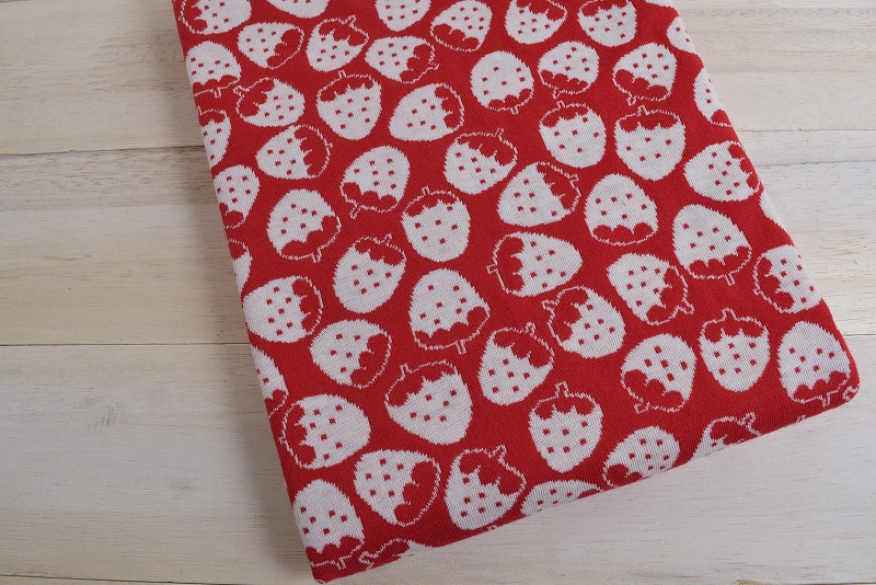 リバーシブルジャガードニット生地 いちご柄 色:レッド/アイボリー