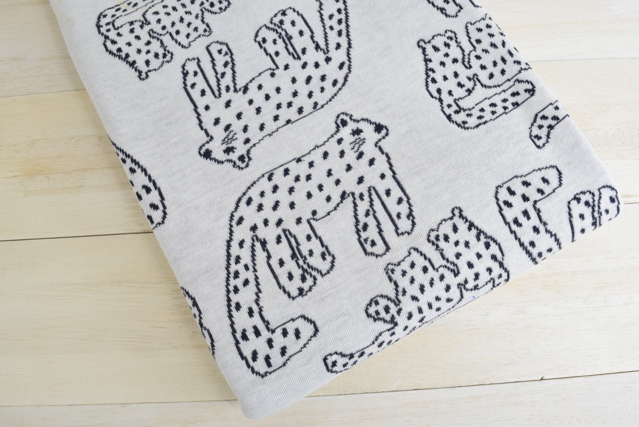 リバーシブルジャガードニット生地 ホワイトパンサー柄 色:ダークチャコール/アイボリー