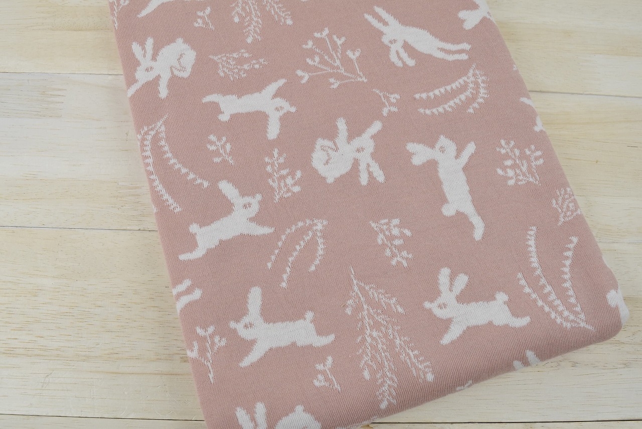 リバーシブルジャガードニット生地 ラビットラビット柄(1mカット生地) 色:ピンクベージュ/アイボリー