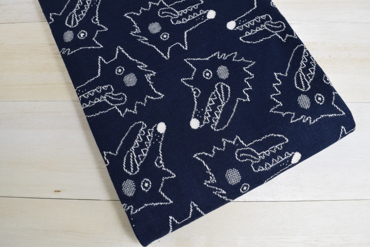 リバーシブルジャガードニット生地 おおかみ柄 色:ネイビー/バニラ