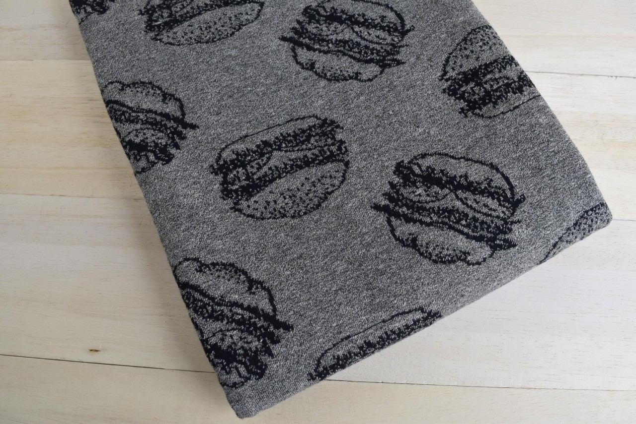 リバーシブルジャガードニット生地 ハンバーガー柄 色:黒/杢グレー