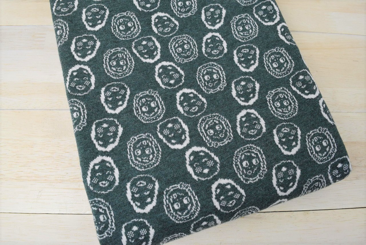 リバーシブルジャガードニット生地 森のくまさん柄 色:杢グリーン/アイボリー