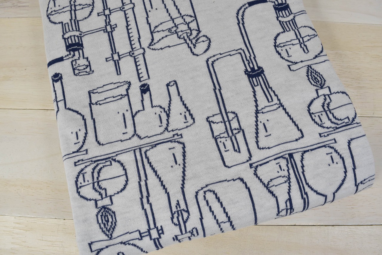 リバーシブルジャガードニット生地 実験道具くんたち柄 色:ダルブルー/アイボリー